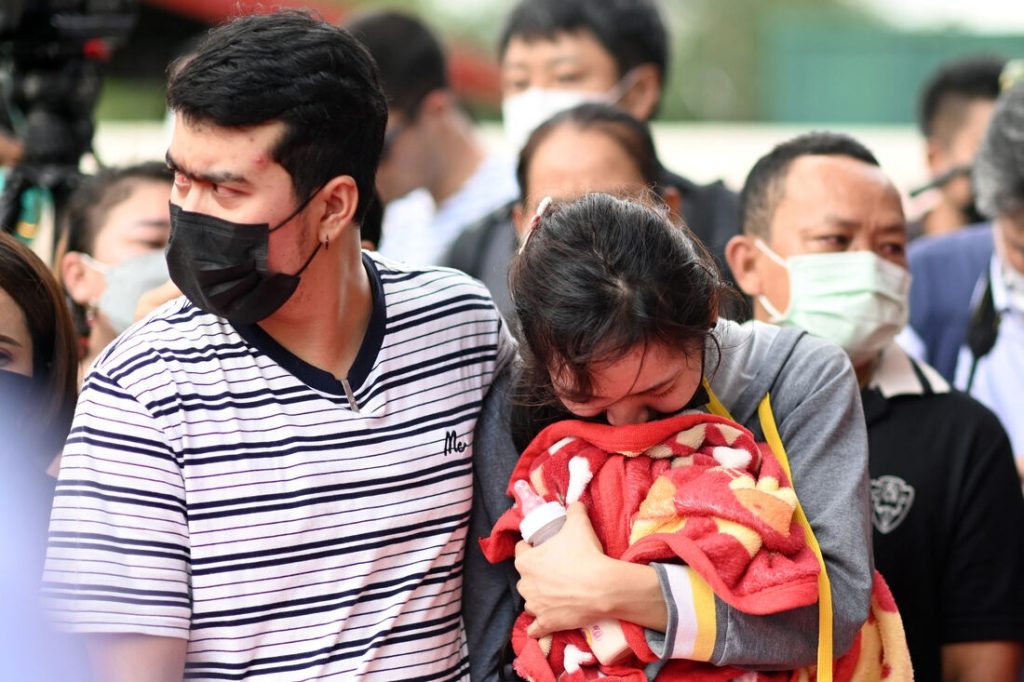 Caixões rosas e brancos com detalhes dourados, com os corpos das 22 crianças mortas em um ataque com armas e facas na Tailândia, foram carregados em um caminhão na noite dessa quinta-feira (6) e levados embora na escuridão.