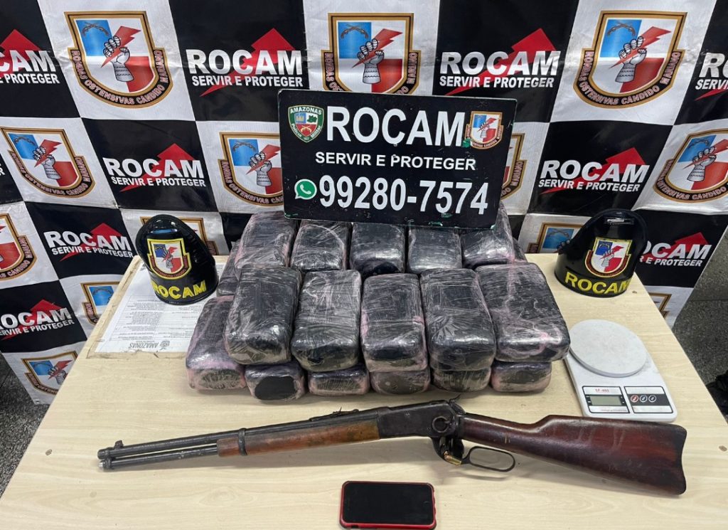 As equipes foram verificar a denúncia e ao se aproximarem do local, um grupo de indivíduos empreenderam fuga. Eles conseguiram alcançar ym homem e com ele foi encontrado um revólver calibre 38, além de 22 kg de maconha e balança de precisão.