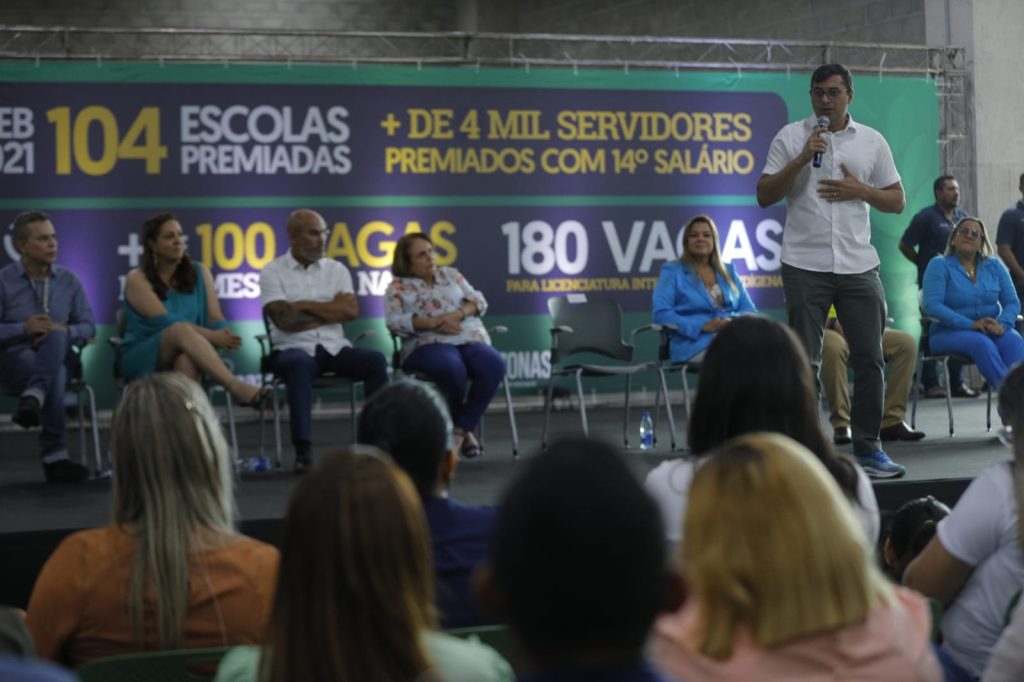 Na ocasião, representantes das unidades escolares receberam das mãos do governador Wilson Lima placas de reconhecimento e troféus pelas metas superadas.
