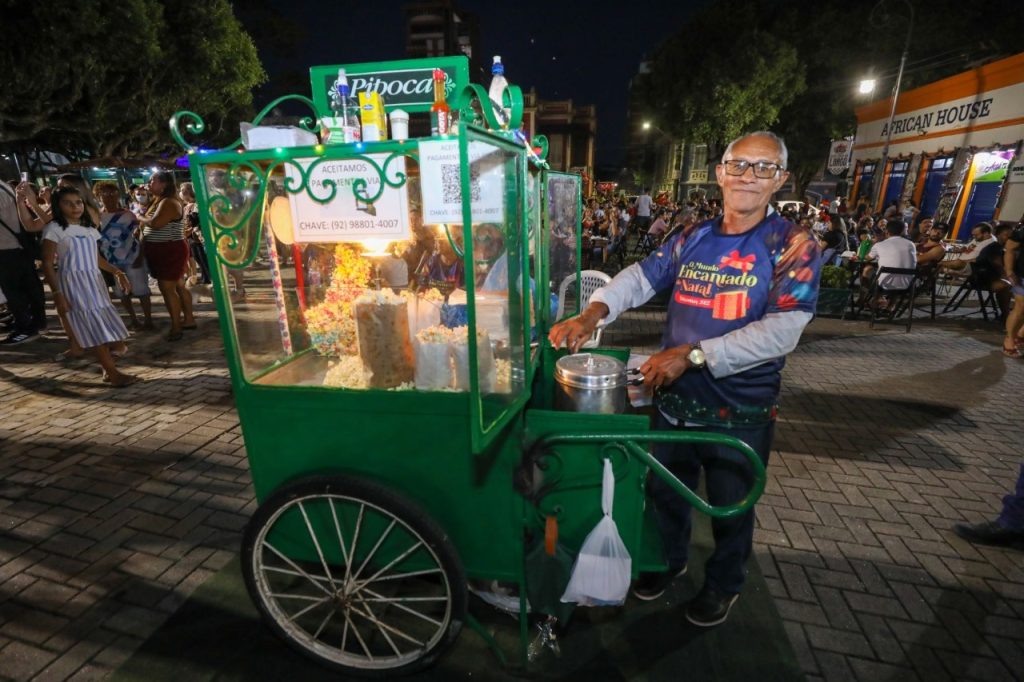 Diante do Largo de São Sebastião lotado, Wilson Lima, a primeira-dama do Amazonas, Taiana Lima, e a filha caçula, Maria Antonella, deram início à programação que deve atrair mais de 1,2 milhão de pessoas. Oportunidade para comerciantes como Raimundo Nunes, 71, que, há 32 anos, vende pipoca no Centro de Manaus e aposta na programação temática para ampliar os lucros.