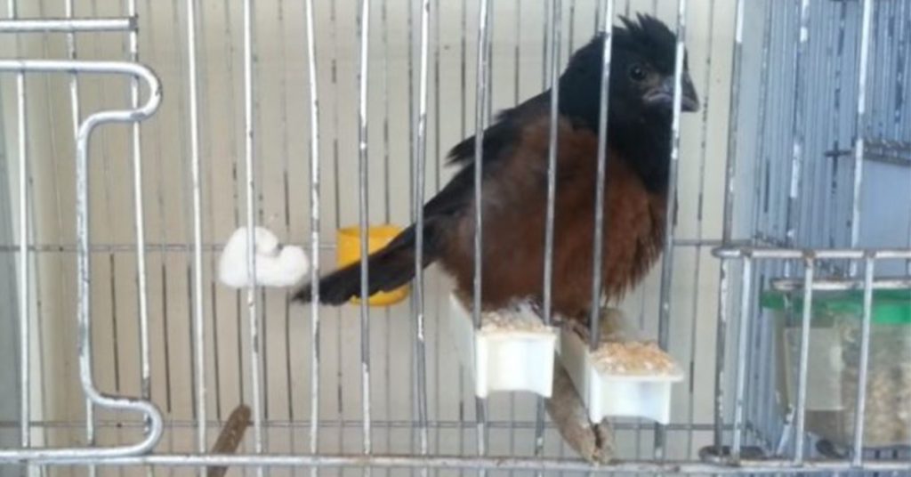 Após uma denuncia, uma equipe policial esteve na casa do jovem e o flagrou pendurado na janela com gaiolas de pássaros da espécie curió.