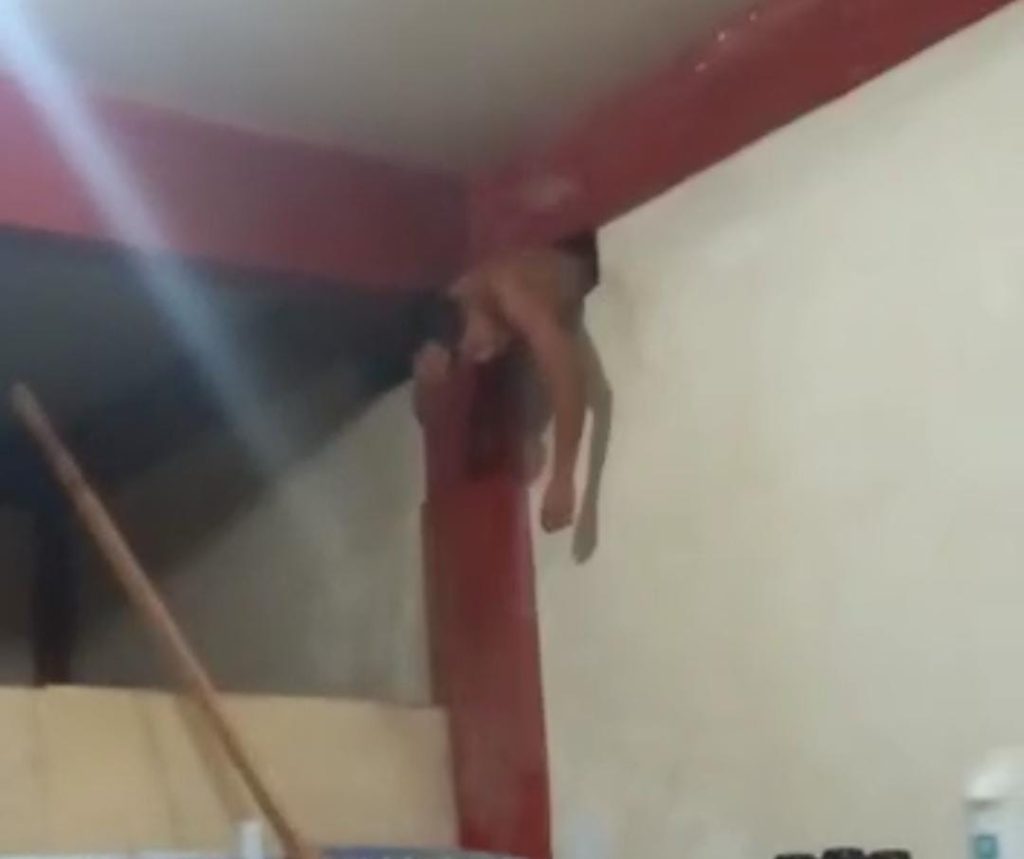 Em um vídeo que circula pelas redes sociais é possível ver o homem com a parte de cima do tronco dentro do comércio e a parte debaixo para fora enquanto ele grita de dor no braço.