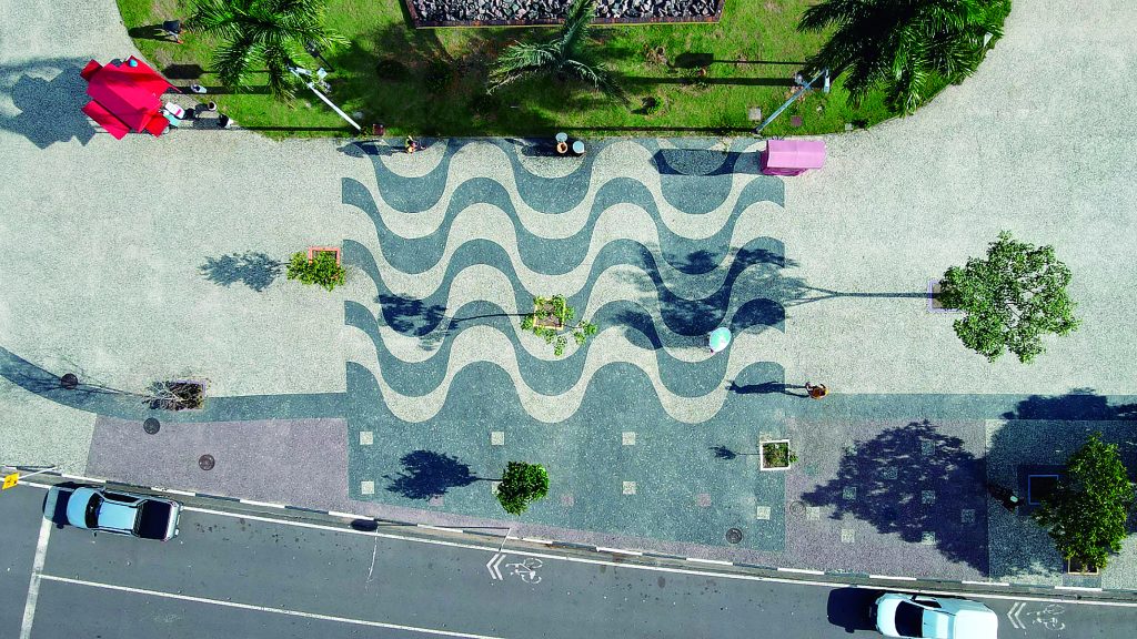 E o calçadão que se estende por quase 5 quilômetros traz os desenhos em pedras portuguesas em preto e branco, semelhante aos que foram usados pelo paisagista e arquiteto Burle Max em obras pelo Brasil, usando o padrão de ondas de praças em Lisboa.