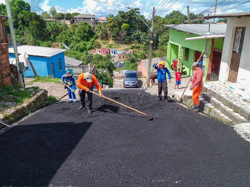 Os trabalhos também são realizados na rua 7 da comunidade Monte Sinai, também no bairro Cidade Nova. Ao todo, 40 toneladas de massa asfáltica são aplicadas nas ruas.