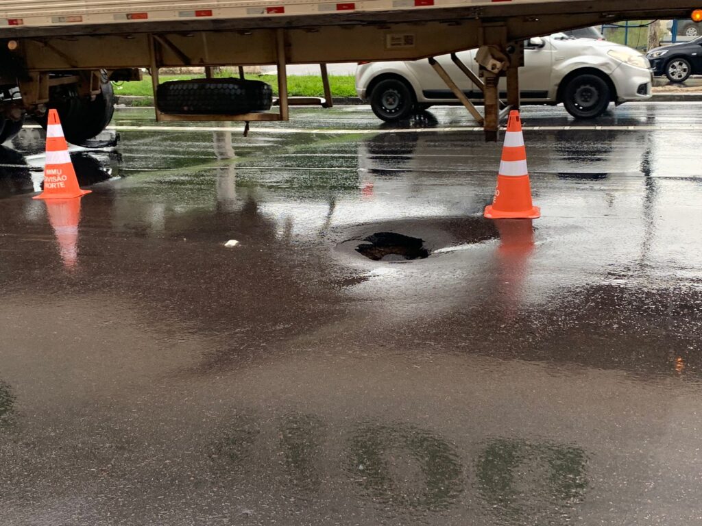 Manaus (AM) – Após a chuva que atingiu Manaus na tarde desta quarta-feira (2), um buraco abriu na avenida Torquato Tapajós. O trecho no sentido Bairro-Centro, nas proximidades de um supermercado, no bairro da Paz, na Zona Centro-Oeste de Manaus, teve duas faixas parcialmente interditadas.