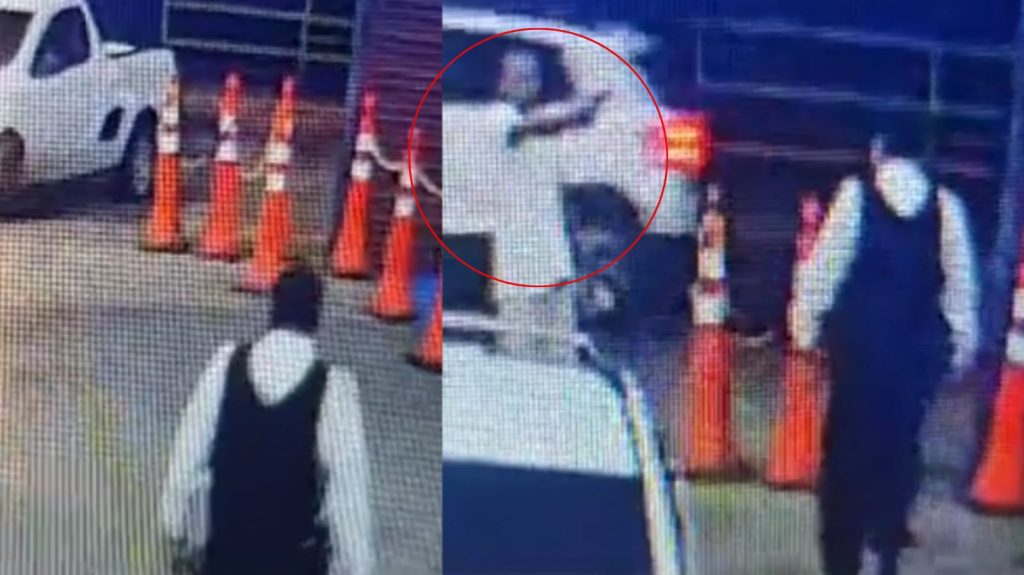 Através do circuito de segurança é possível ver um homem e branco se aproximando do vigilante, e logo em seguida, ele tira a arma de sua cintura, apontando para Elias.