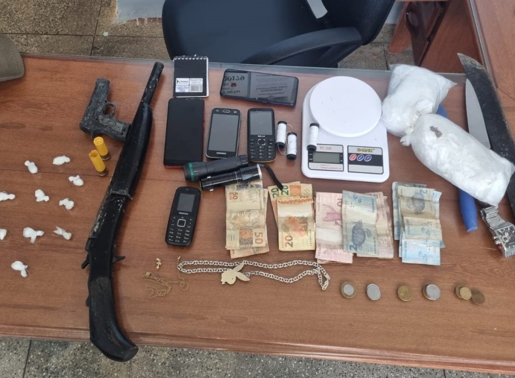 Os envolvidos foram autuados por posse ilegal de arma de fogo e tráfico de drogas. Eles ficarão à disposição da Justiça.