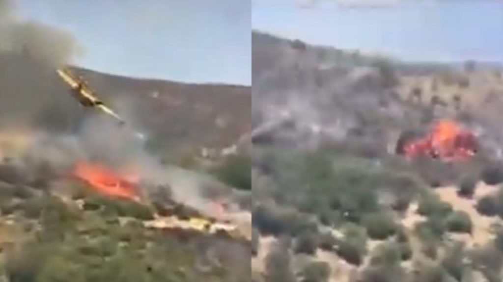 O primeiro-ministro Kyriakos Mitsotakis, alertou que incêndios estão destruindo casas e forçando a retirada de milhares de turistas da ilha de Rodes e que os próximos dias serão bem difíceis.Imagens mostram o avião jogando água sobre um incêndio e depois colidindo com uma encosta e logo em seguida explode em chamas.
