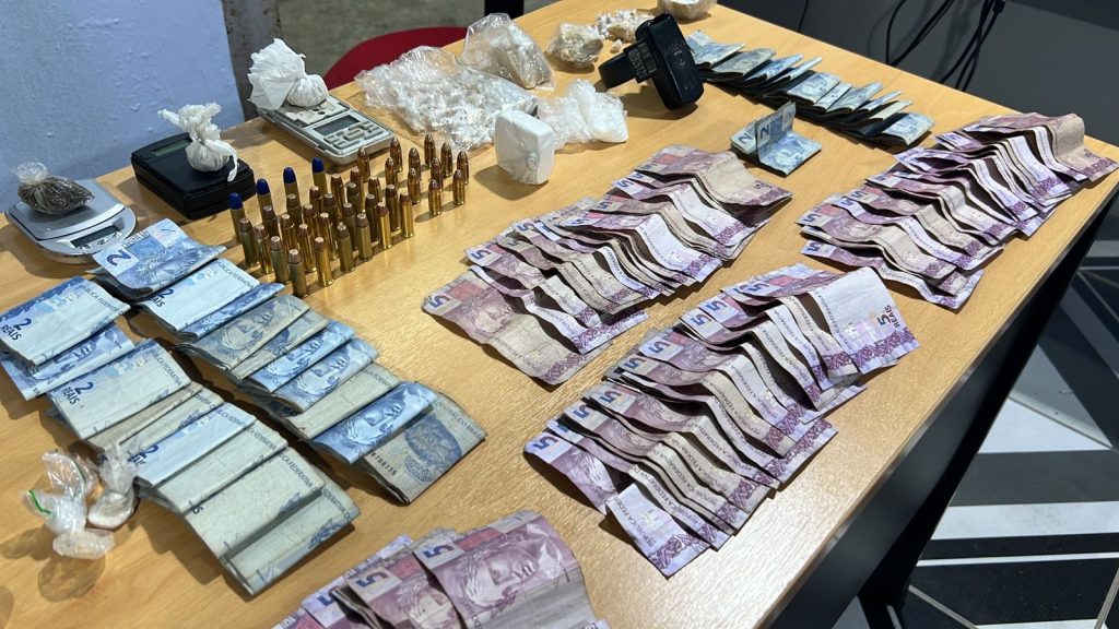“Em ato contínuo, eles empreenderam fuga em direção a mata, e um deles deixou cair uma arma de fogo e munições. Por se tratar de uma vila de quitinetes, continuamos a averiguação na localidade. Em uma delas, se encontravam Gabrielly e Naiara, além de diversas porções de cocaína e maconha, R$ 710 em espécie, aparelhos celulares, três balanças de precisão e uma tornozeleira eletrônica”,