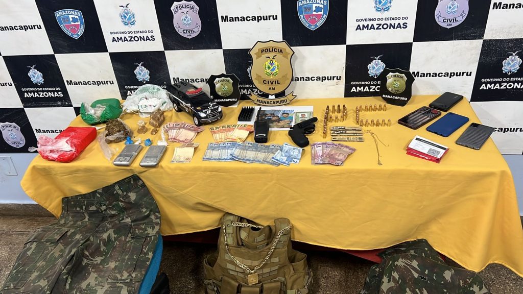 “Durante buscas na residência do suspeito, apreendemos porções grandes de diversos entorpecentes, como maconha, pedra e cocaína, além de armas de fogo, munições, rádio transmissor, balança de precisão, colete a prova de balas, bem como uma roupa rajada semelhante à de militar”, falou.