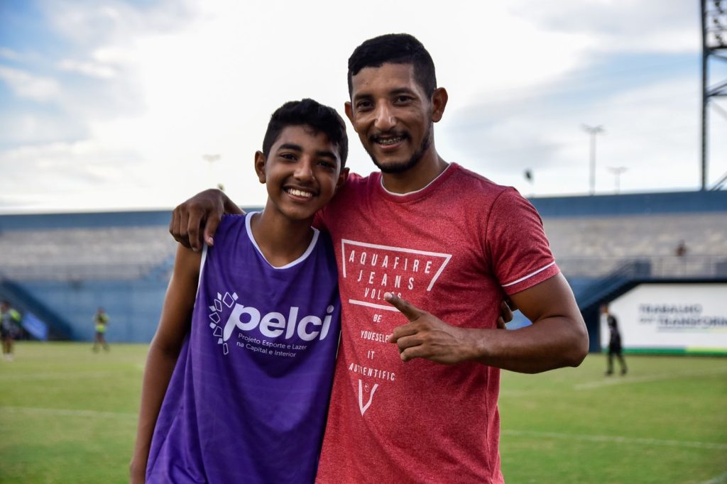 A paixão pelo futebol é capaz de transcender gerações. Diego de Souza Gadelha, morador do Bairro São Raimundo, e seu filho Vitor Douglas Melo, são exemplos do amor pelo esporte. O jovem de 14 anos de idade que sonha ser jogador profissional é aluno do Programa Esporte e Lazer na Capital e Interior (Pelci), no Estádio Ismael Benigno.