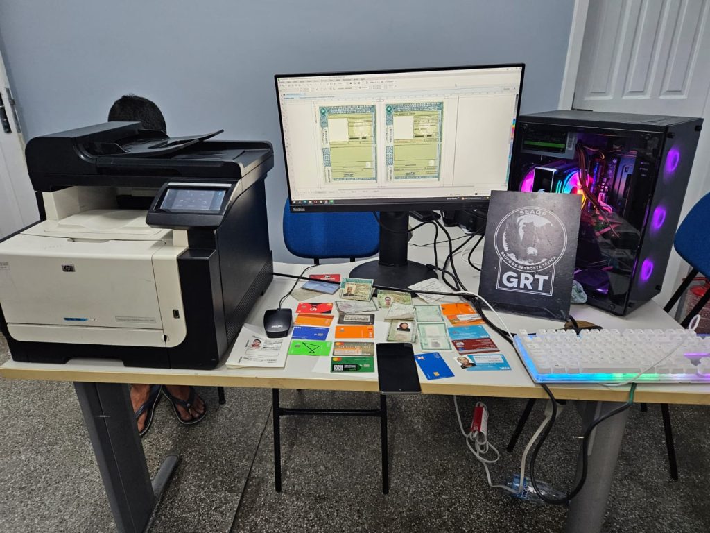 Foram apreendidos, ainda, um computador, uma impressora, uma tela de computador, carteiras e cartões falsificados. “No computador dele, tem carteira de identidade, carteira de habilitação, de mercados locais e muitos outros documentos”, afirmou o secretário-executivo da Seaop, coronel César Andrade.
