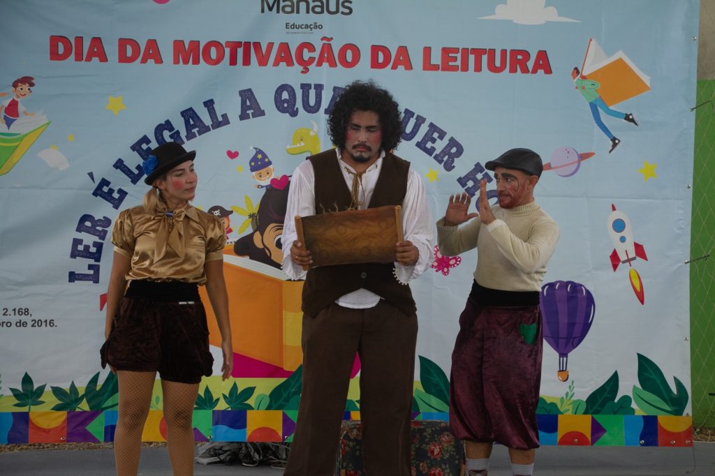 Manaus (AM) – A Prefeitura de Manaus, por meio da Secretaria Municipal de Educação (Semed), realizou, nesta quinta-feira, 17/8, mais uma ação alusiva ao “Dia da Motivação da Leitura”. Desta vez, na escola municipal São Sebastião 2°, na comunidade São Sebastião, região do Tarumãzinho, rio Negro. O evento também reuniu estudantes das escolas municipais Ebenezer, Canaã e Raul Pompéia, ambas no rio Negro, que prestigiaram a apresentação do espetáculo “O Cavaleiro da Armadura de Sol”, da Associação Arte Brasil.