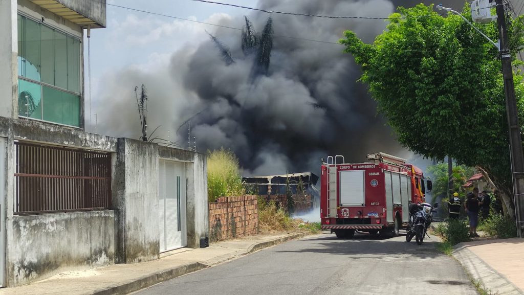 Um incêndio de grandes proporções atingiu uma oficina na rua Jaguariavia, conjunto Águas Claras, bairro Novo Aleixo, Zona Norte de Manaus, durante o início da tarde desta quinta-feira (24).