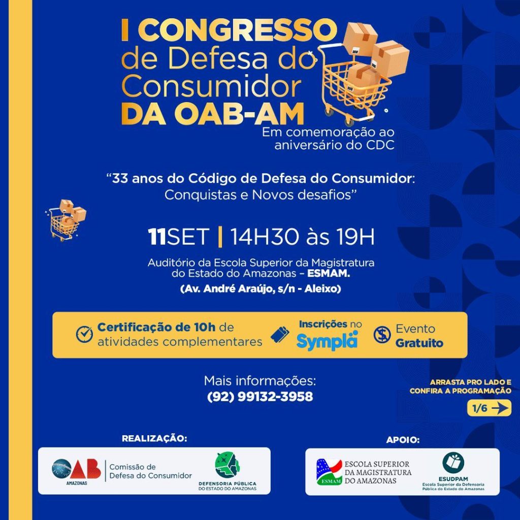 Manaus (AM) – Na próxima segunda-feira (11), a Ordem dos Advogados do Brasil — Seccional do Amazonas (OAB-AM), em parceria com a Defensoria Pública do Estado do Amazonas e a Escola Superior de Magistratura do Estado do Amazonas (ESMAM), promoverá o I Congresso de Defesa do Consumidor da OAB-AM. O evento será realizado em comemoração aos 33 anos do Código de Defesa do Consumidor e acontecerá no auditório da ESMAM, prédio anexo ao Tribunal de Justiça do Amazonas (TJAM), das 14h30 às 19h.