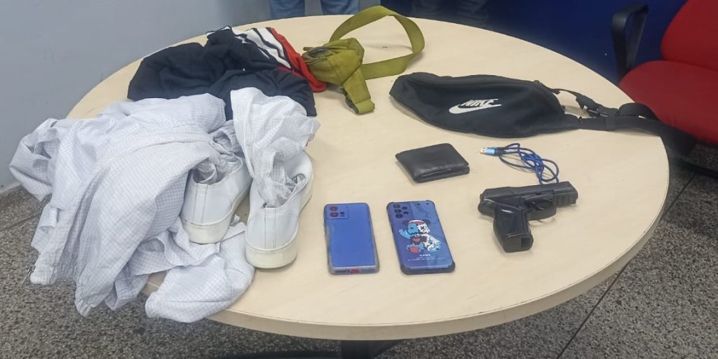 Durante a revista foram apreendidos dois celulares; um macacão de serviço de uma empresa do Distrito Industrial; um simulacro arma de fogo; uma motocicleta 160 Start, cor vermelha; uma carteira porta-cédula; R$ 32 em espécie e uma pochete preta.