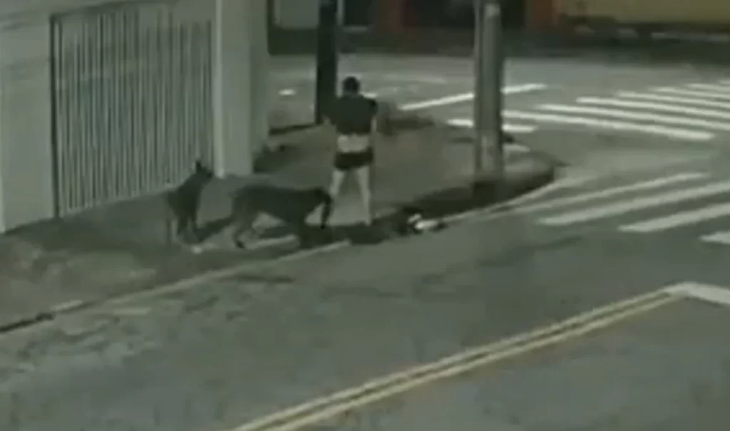 As imagens das câmeras de segurança mostram a vítima tentando escapar das mordidas dos cães, que chegam a arrancar a roupa do homem, que ficou na calçada apenas de cueca.