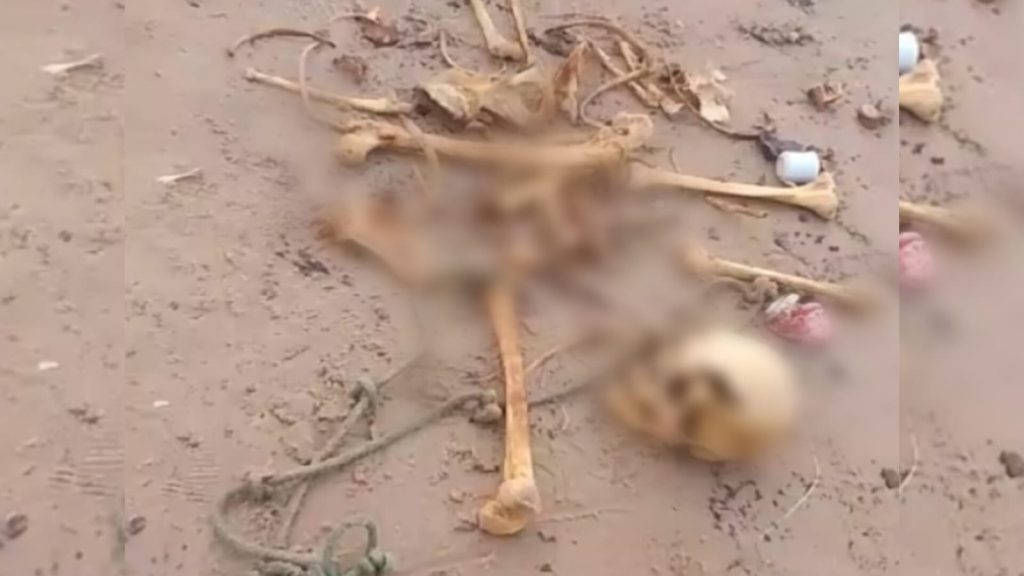 Entre os ossos, era visível que a parte do crânio tinha um ferimento, possivelmente ocasionado por disparo de arma de fogo.