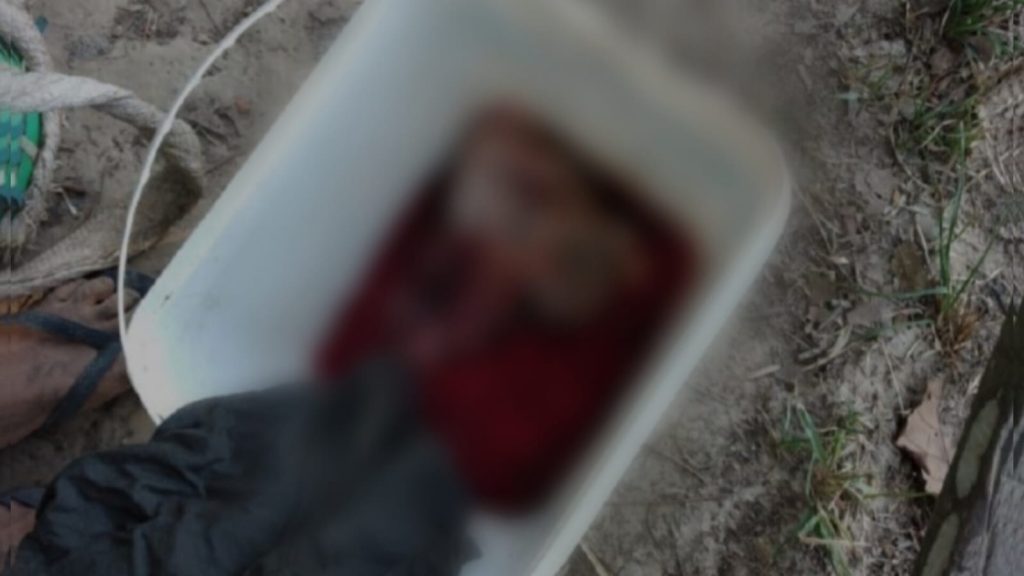 Os restos mortais do bebê, que tinha aproximadamente 6 a 7 meses, foi achado por um pescador, que havia saído durante a madrugada e visualizou o balde flutuando no rio.