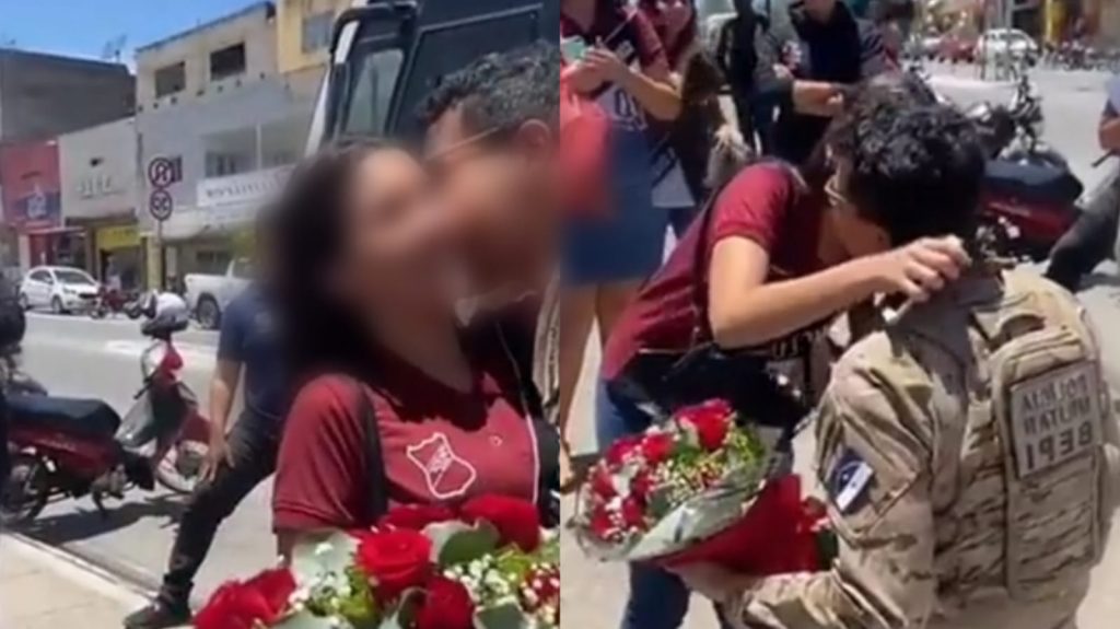 Um policial do Batalhão Especializado de Policiamento do Interior (Bepi) da Polícia Militar de Toritama, agreste de Pernambuco, fez uma surpresa para uma adolescente estudante do 9º ano na porta da escola onde a jovem estuda. O vídeo repercutiu negativamente nas redes sociais neste fim de semana.