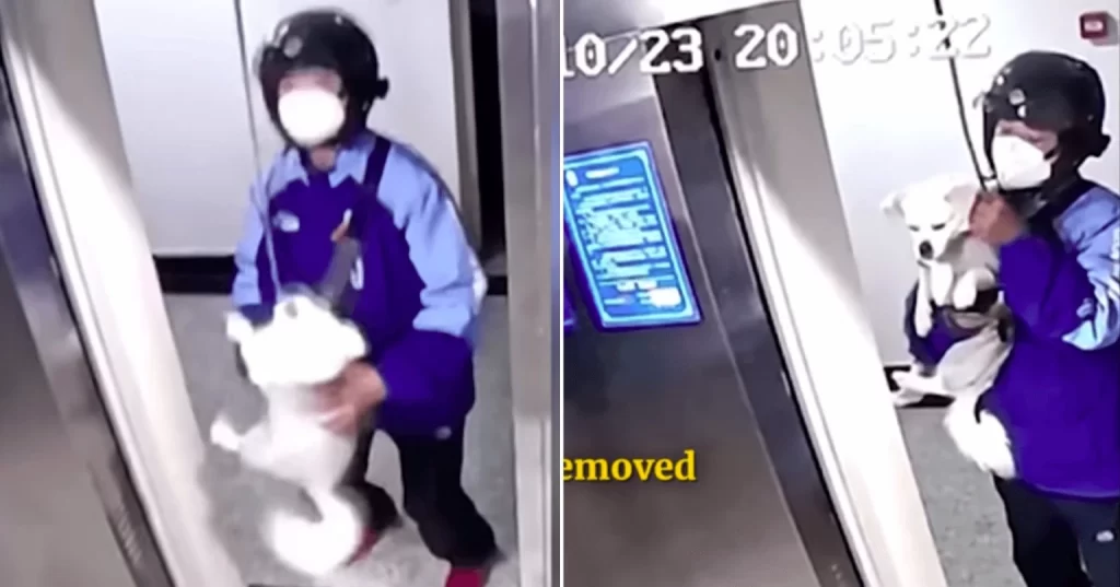 As imagens são intensas de se assistir. Mas por obra do acaso, havia entregador que estava esperando o elevador chegar no seu andar para ir embora. No vídeo, é possível ver que o rapaz até leva um grande susto com cachorro pendurado bem ali.