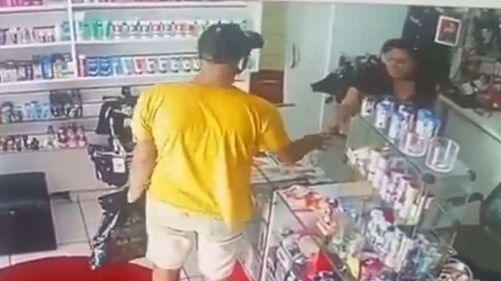Manaus (AM) – Imagens de câmeras de segurança mostram um homem roubando uma loja no Centro de Manaus, na última terça-feira (21). O suspeito roubou dinheiro do caixa da loja, mas desistiu de levar o celular da funcionária, que estava bastante nervosa com a abordagem.