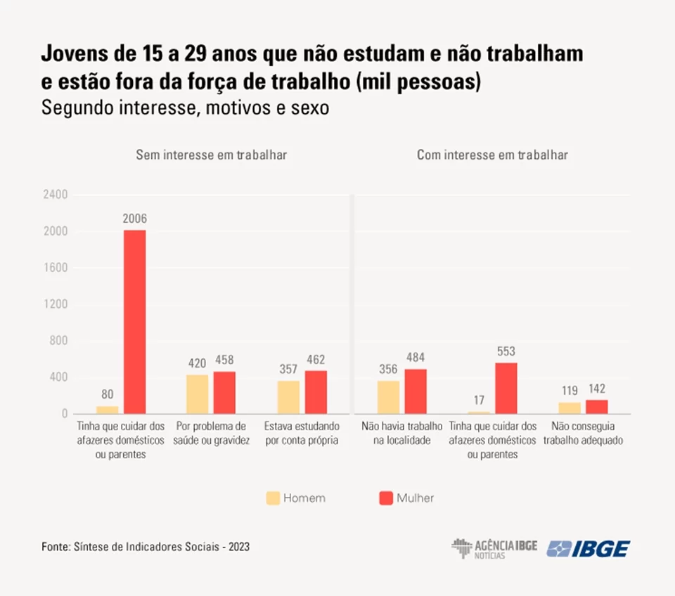 Segundo a pesquisa, a maior proporção de mulheres nessa situação tem relação com os afazeres domésticos e o trabalho como cuidadoras de parentes.