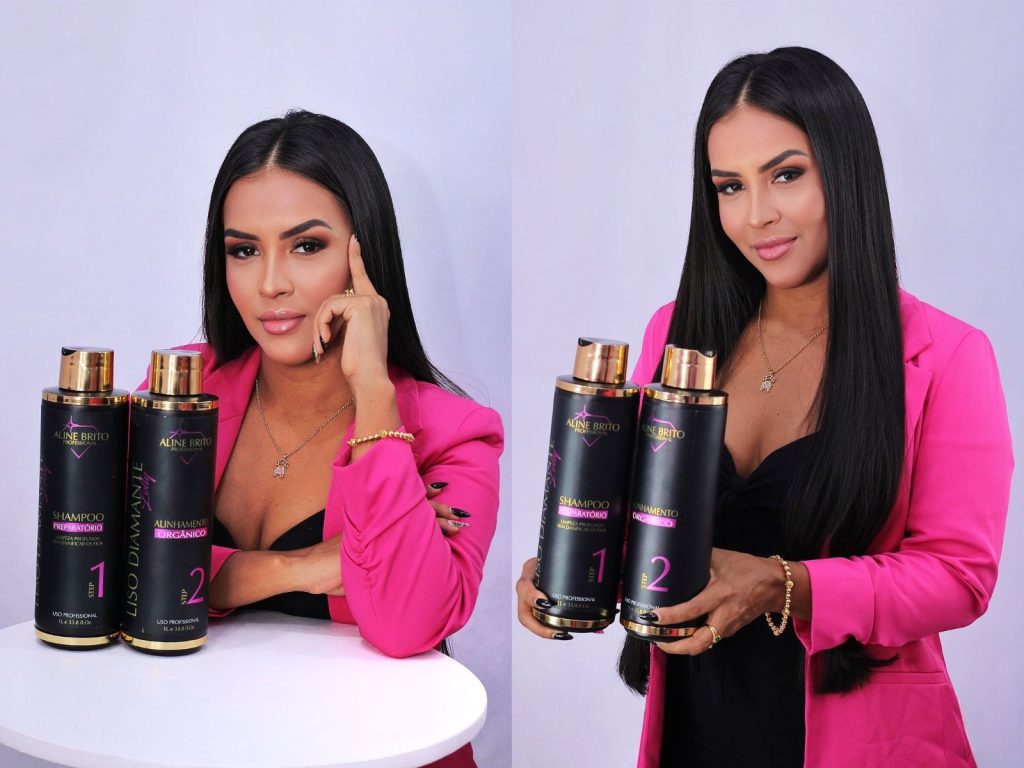 A partir dessa virada de “chave”, a cabeleireira idealizou em parceria com um químico, a linha de produtos Aline Brito Profissional (AB), carinhosamente chamada de “Liso Diamante”, por causa do resultado satisfatório vinculado à experiência das clientes.