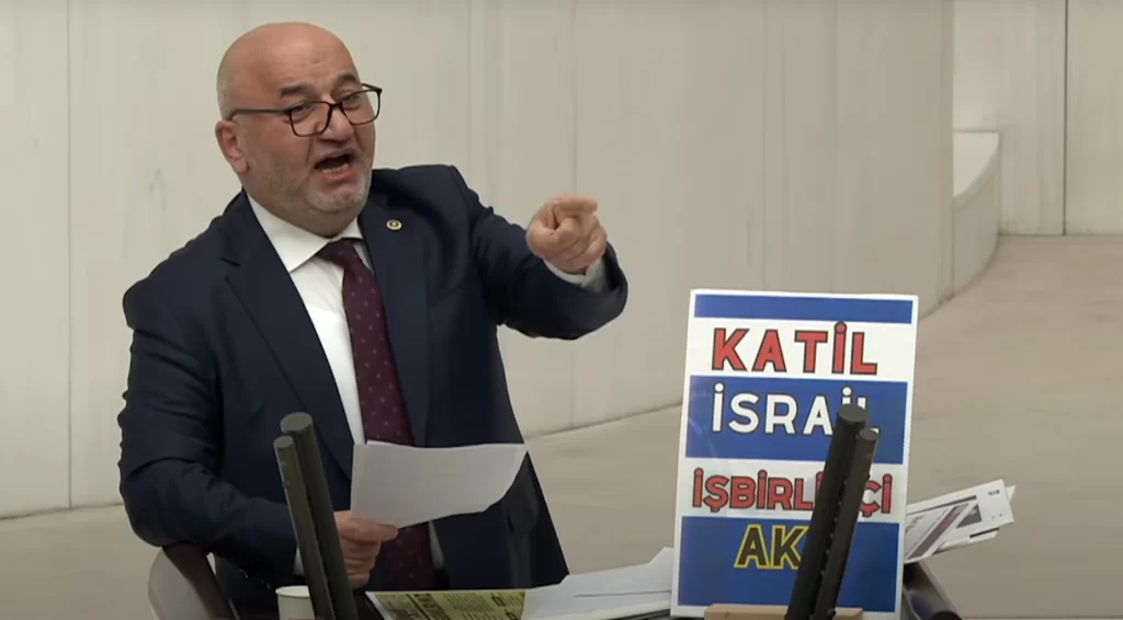 Ele criticava o Partido AKP, do presidente Tayyip Erdogan, sobre o comércio contínuo da Turquia com Israel, apesar da guerra em Gaza, e apesar das críticas retóricas do governo ao bombardeio militar de Israel.