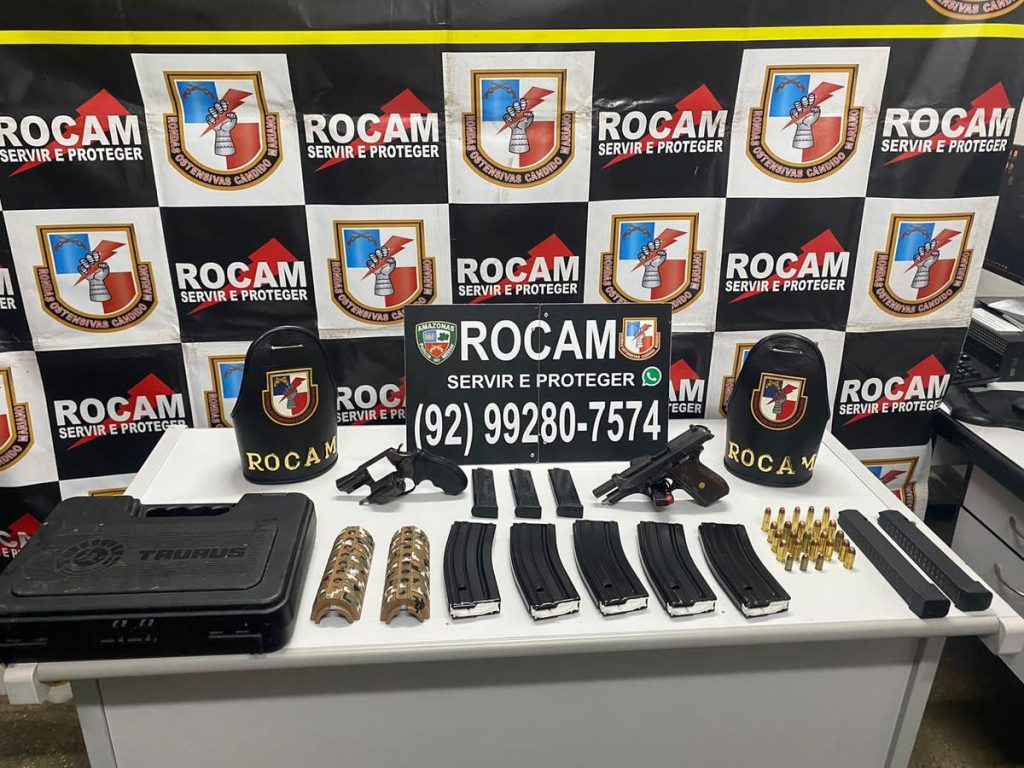 Na bolsa, havia uma pistola calibre 380, um revólver calibre 38, cinco carregadores de fuzil calibre 556, três carregadores de pistola .45, um guarda mão de fuzil calibre 556, um carregador calibre .40 alongado, um carregador 9 milímetros alongado, 24 munições de calibre diversos é uma maleta de pistola da marca Taurus.