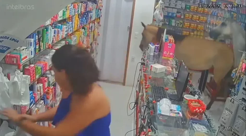 Câmeras de segurança flagraram dois cavalos invadindo uma farmácia de Rio das Ostras (RJ). As cenas foram registradas por volta das 19h do último sábado (30). Os animais aparecem na entrada do estabelecimento enquanto pessoas no local tentam espantá-los. Um deles chega a dar um coice no vidro da loja.