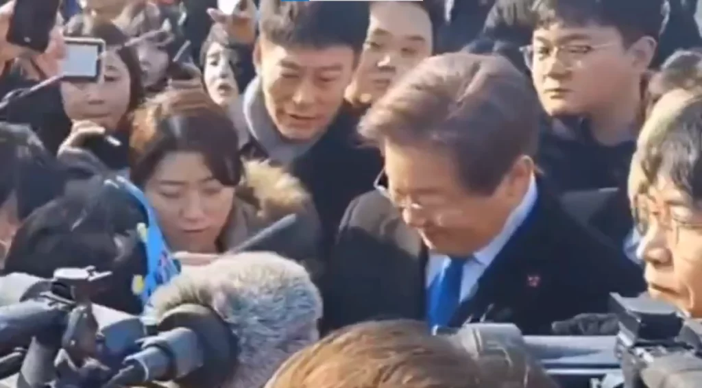 Lee estava visitando o canteiro de obras do Novo Aeroporto de Gadeokdo e conversando com repórteres quando foi atacado, deixando o político com uma laceração de 1 centímetro no lado esquerdo do pescoço, disse o porta-voz do Partido Democrata, Kwon Chil-seung.