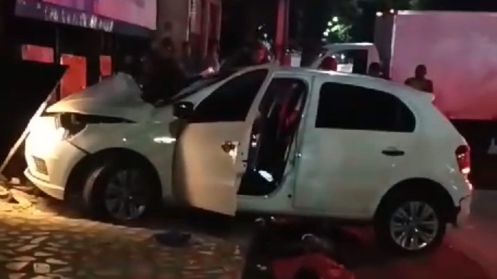 O carro utilizado pelos suspeitos estava com a placa adulterada, e durante a tentativa de fuga, o motorista perdeu o controle da direção e colidiu com a frente de uma loja.