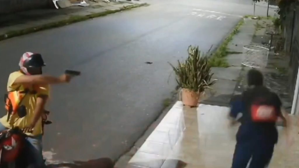 A vítima ainda cai na calçada ao correr para se proteger. Depois se levanta e consegue fugir.