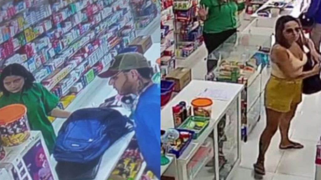 O notebook que estava no balcão da drogaria é revistado pelo suspeito, mas não é levado. Em certo ponto da gravação das câmeras de segurança, também é possível ver o casal mexendo no local do caixa. Antes de deixarem o local, a mulher ainda pega vários produtos que estavam expostos nas prateleiras do comércio.