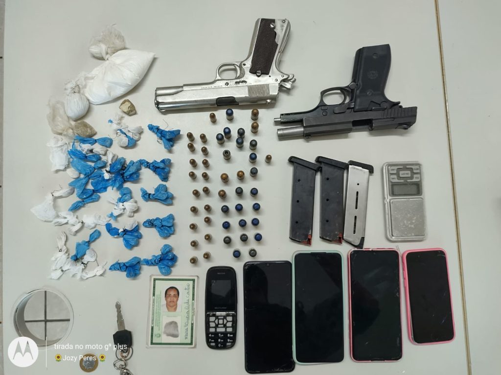No local foram apreendidas duas pistolas de calibre 45, três carregadores do mesmo calibre, 40 munições, 73 trouxinhas de oxi, 88 gramas de cocaína, uma balança de precisão, cinco aparelhos celulares, além de uma motocicleta com restrição de roubo.