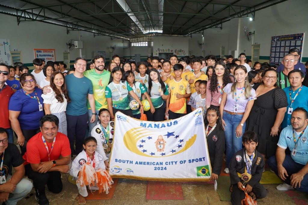 Manaus (AM) – Manaus vai receber, nesta quinta-feira (22), a entrega do título “Manaus Cidade Sul-Americana do Desporto 2024”, na praia da Ponta Negra, Zona Oeste da capital amazonense. Em alusão ao evento, alunos, gestores e servidores da Prefeitura de Manaus participaram da “Passagem da Bandeira” em sete unidades de ensino de todas as zonas da cidade. A programação segue até sábado (24).