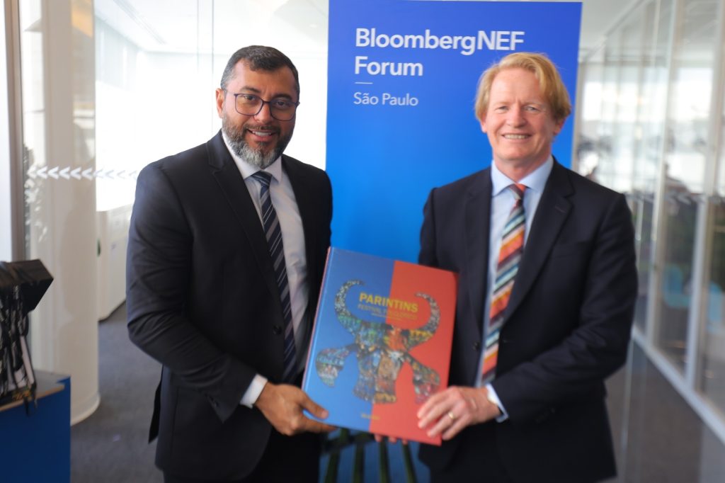 O governador do Amazonas esteve acompanhado do secretário estadual de Meio Ambiente, Eduardo Taveira, em encontro moderado pela chefe de transição energética da BloombergNEF, Luiza Demôro.