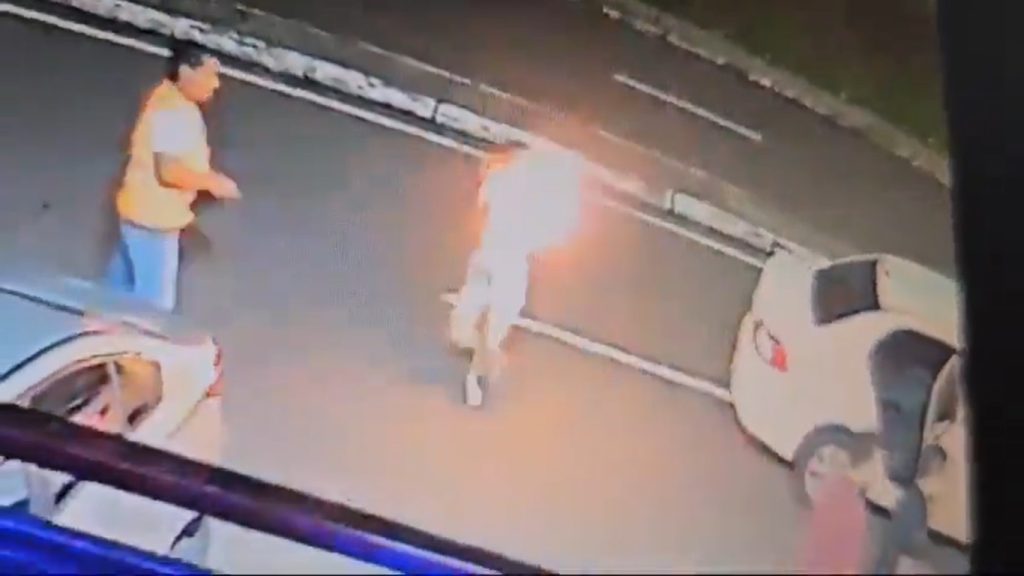A universitária também sofreu queimaduras. O momento em que ela tentava escapar das chamas foi registrado por câmeras de segurança do estabelecimento nas redondezas.