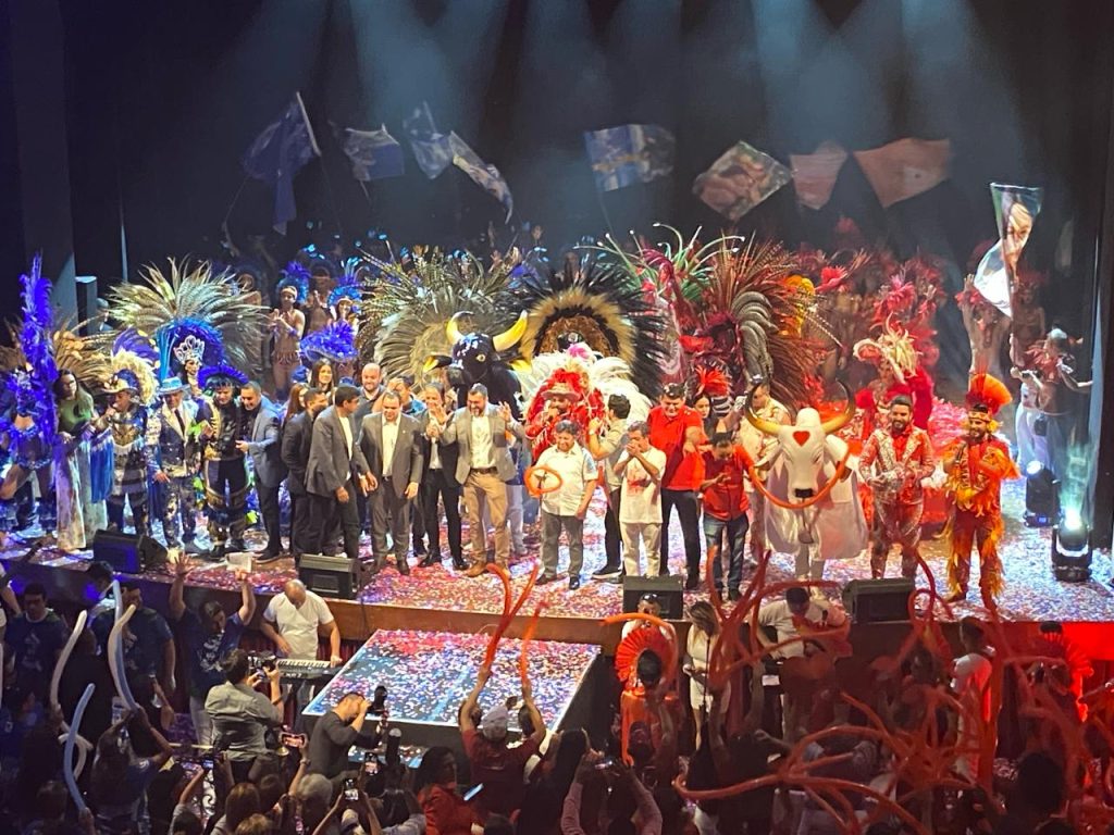 Manaus (AM) – O governador do Amazonas, Wilson Lima, oficializou a temporada de eventos do 57º Festival de Parintins nesta sexta-feira (15). Na cerimônia no Teatro Amazonas, no Centro de Manaus, também foi apresentado o artista vencedor do concurso Mural Bumbódromo 2024, que será o responsável pela nova fachada do prédio e a marca do Festival de 2024, criada a partir da arte vencedora.