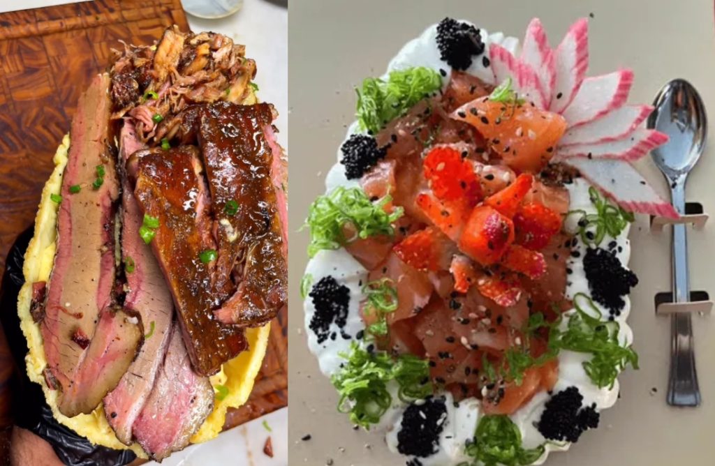 O típico prato brasileiro não ficaria de fora. Ovo de churrasco tem como base uma omelete de queijo parmesão. O recheio leva arroz texano, carne de porco defumada e macarrão ao molho de queijos. Depois, o ovo é finalizado com carne bovina defumada e costela suína com molho barbecue.