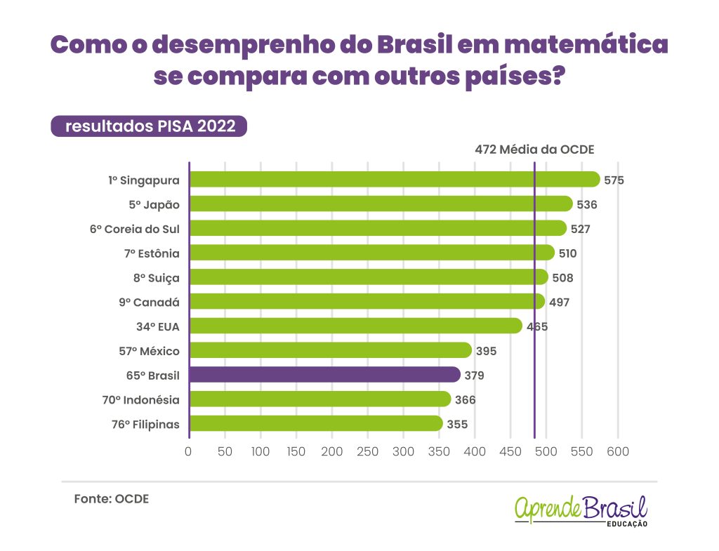 A média entre os países da Organização para a Cooperação e Desenvolvimento Econômico (OCDE) é de 69% – o que significa que o Brasil está cerca de três anos atrasado em matemática em relação à média dos países da OCDE