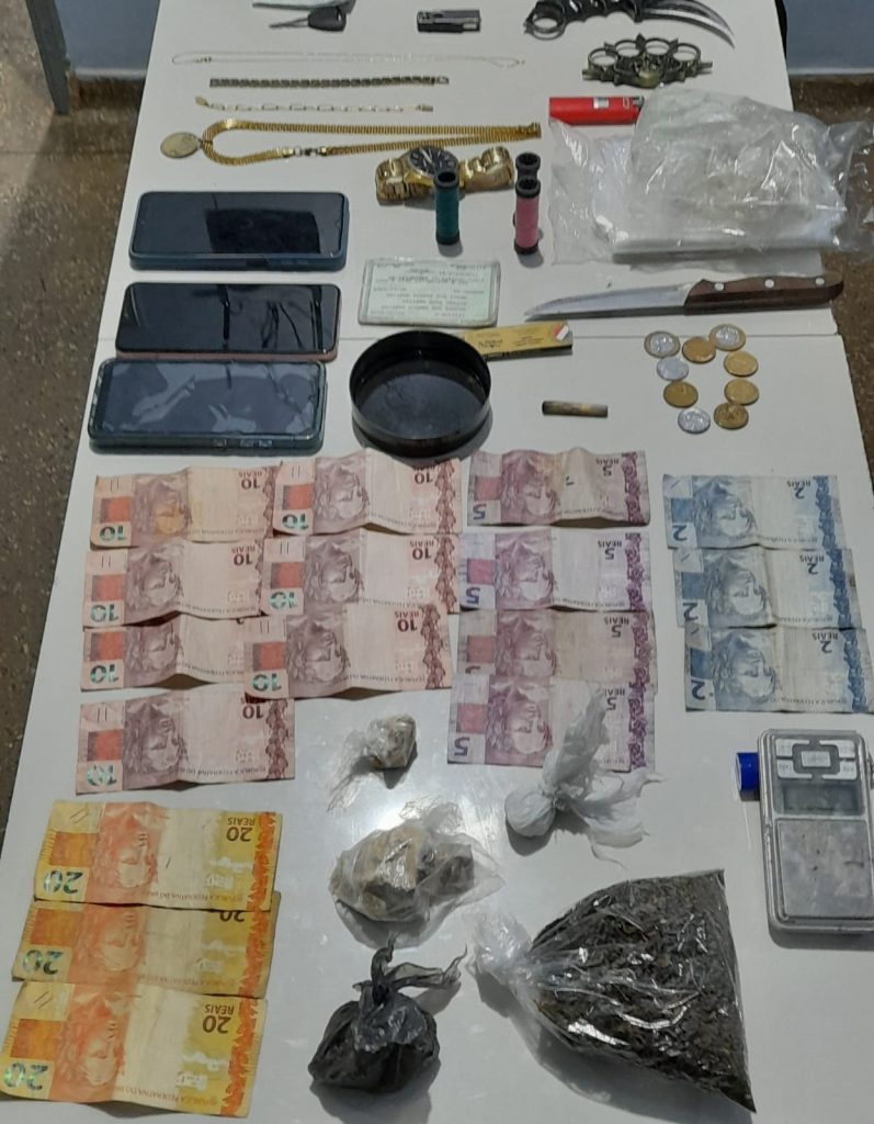 Conforme o delegado, o casal também foi encontrado no local, onde foram apreendidas porções médias de pedra de oxi, uma porção grande de maconha e cocaína, quantias de dinheiro em notas diversas, celulares, jóias e outros objetos.