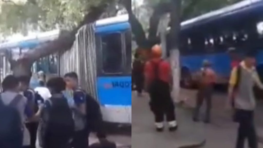 Um vídeo divulgado nas redes sociais mostra o coletivo parado na via pública, e é possível ver um galho na parte sanfonada do ônibus. Não houve registro de vítimas.