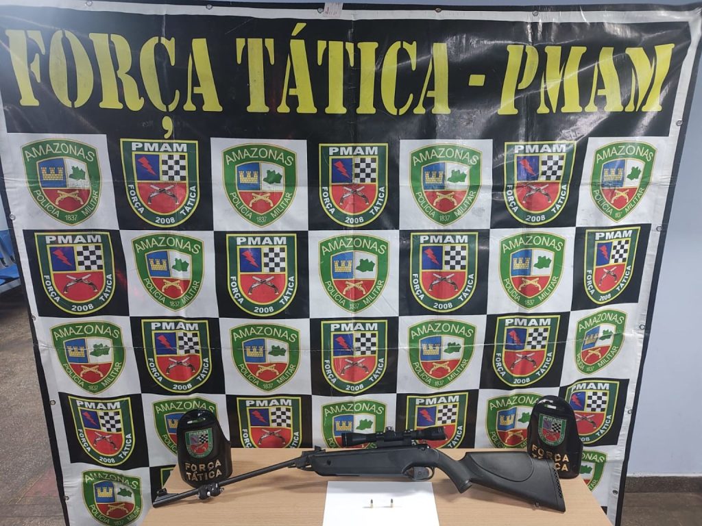 Os policiais militares da Força Tática, acompanhados da vítima, foram ao endereço apontado por ela e, ao chegarem, realizaram a prisão do suspeito e apreenderam um rifle de ar comprimido, calibre 22, com duas munições do mesmo calibre.