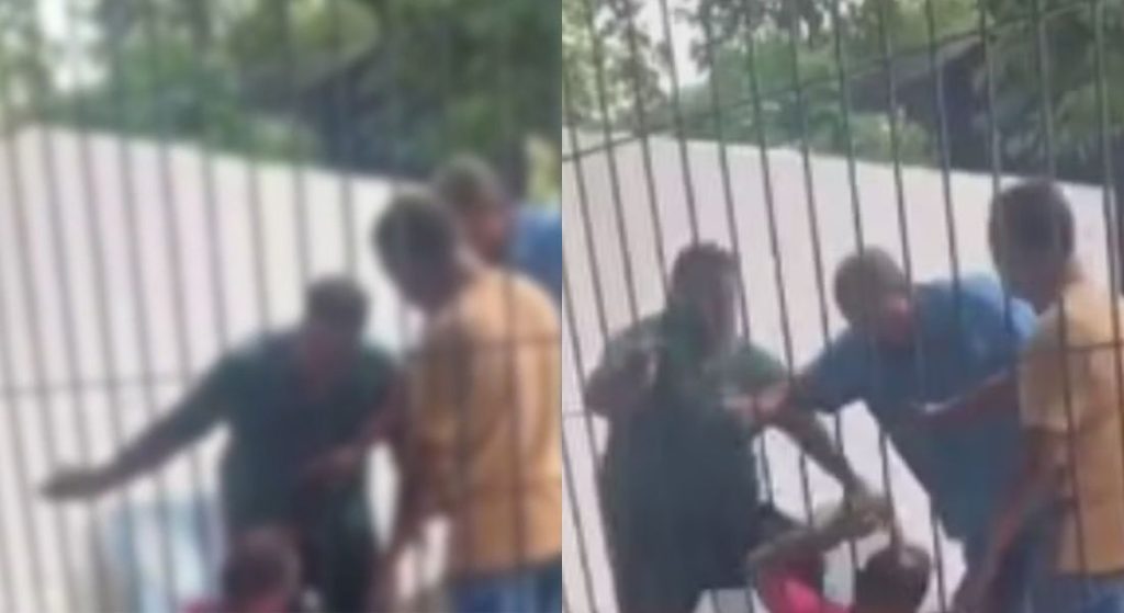 Imagens que circulam nas redes sociais mostram o genitor (de camisa verde) xingando e agredindo o suspeito com tapas e chutes, na área externa da Escola Técnica Estadual (ETE) Mariano Teixeira, onde o caso aconteceu.