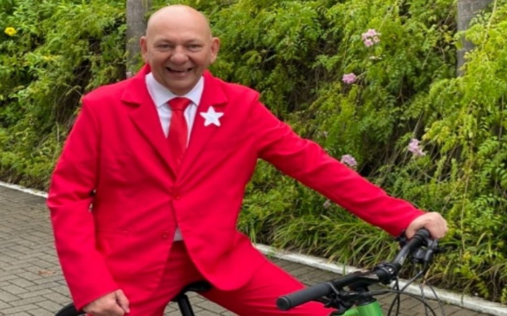 Em outra publicação, ele aparece em cima de uma bicicleta, vestido de vermelho e com um aparelho celular na mão. De acordo com a própria publicação, o figurino foi escolhido propositalmente para representar um comunista.