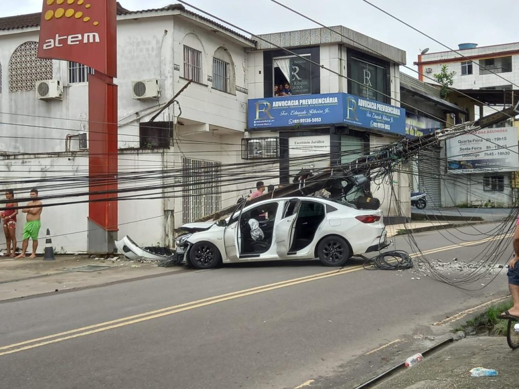 Com o impacto, o poste caiu e a fiação ficou comprometida, caindo no meio da via. A colisão deixou a frente do carro destruída.