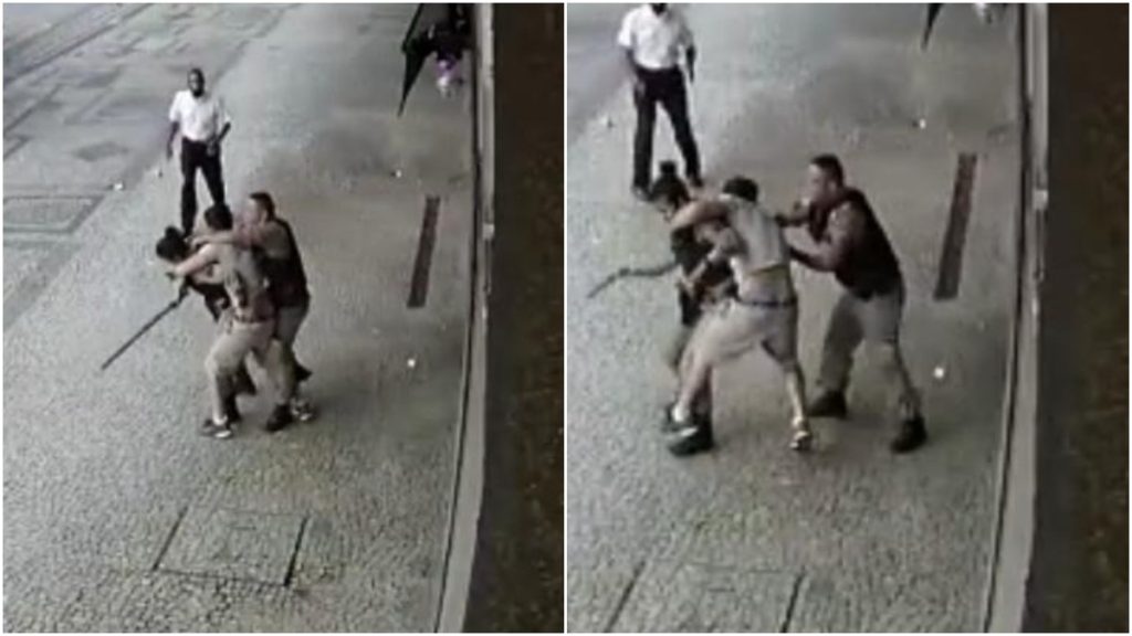 Belo Horizonte (BH) – Câmeras de segurança de um prédio localizado no bairro Belvedere, na região Centro-Sul de Belo Horizonte, flagraram o momento exato em que um lutador de jiu-jitsu atacou dois policiais, na sexta-feira (8). No registro, o homem é visto descendo de um ônibus suplementar e dando início à confusão. Segundo a PM, ele foi preso em flagrante por desacatar os agentes e agredi-los.