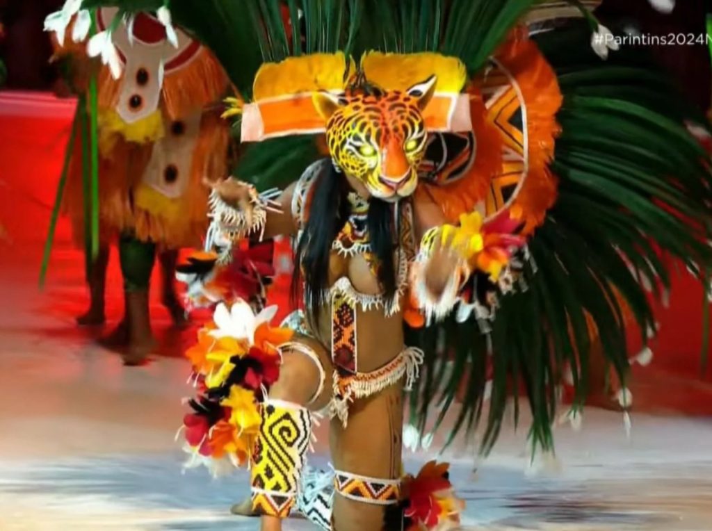 Durante apresentação a cunhã-poranga do boi Garantido, Isabelle Nogueira enfrentou problemas enquanto tentava se transformar em onça, na primeira noite do festival de Parintins, nesta sexta-feira (28).